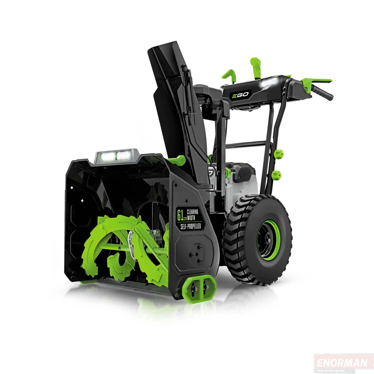 Szerokość robocza 61cm oraz wysokość gardzieli 51 cm pozwalają na szybkie pokonanie najgłębszego śniegu.Usunięcie pokrywy Śnieżnej przekraczającej 35 cm z podjazdów czy chodników nie stanowi już żadnego problemu. Cztery reflektory LED umożliwiają komfortowe odśnieżanie nawet w warunkach słabego oświetlenia - rankiem czy wieczorem. Panel sterujący oraz regulacja ustawienie komina w zakresie 200 stopni pozwalają na pełną kontrolę kierunku i odległości wyrzutu śniegu aż do 13 metrów. Układ i ergonomia panelu sterującego sprawia iż sterowanie jest łatwe nawet w grubych zimowych rękawicach.